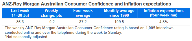 ANZ Economist Sophia Angala said: "The ANZ-Roy Morgan Australian Consumer Confidence series largely moved sideways last week, falling just 0.2 points to 86.3 points. The result was driven by a mixture of outcomes across the subindices."