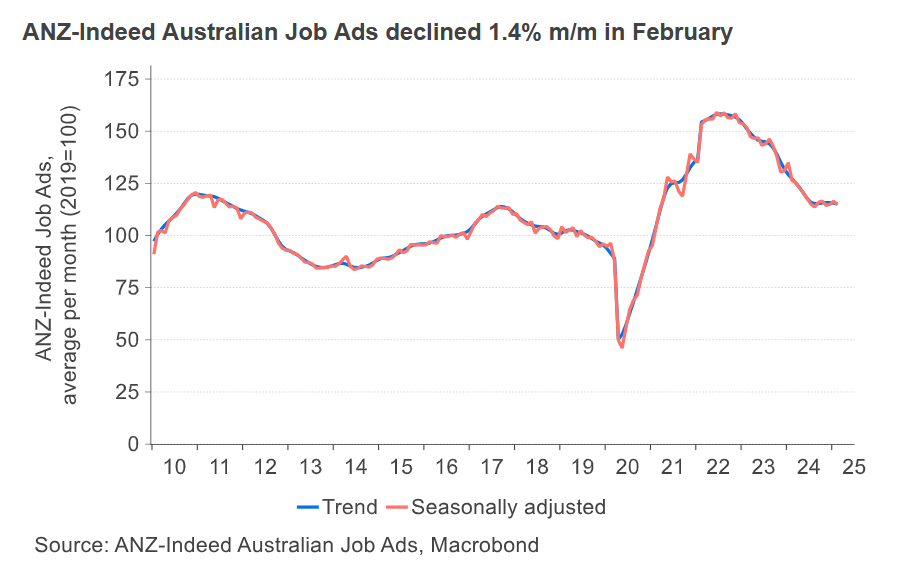 "ANZ-Indeed Australian Job Ads has only declined 0.1 per cent so far in 2025, and the series is up just 0.9 per cent from its August low. The stabilisation in the series follows robust employment growth of 44,000 in January and an all-time high in the participation rate of 67.3 per cent," ANZ Economist, Sophia Angala said.