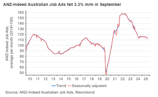 ANZ-Indeed Australian Job Ads fell 3.3 per cent m/m in September following a downwardly revised 0.3 per cent m/m decline in August. The trend series fell 1.5 per cent m/m, after a 1.0 per cent m/m fall in August.