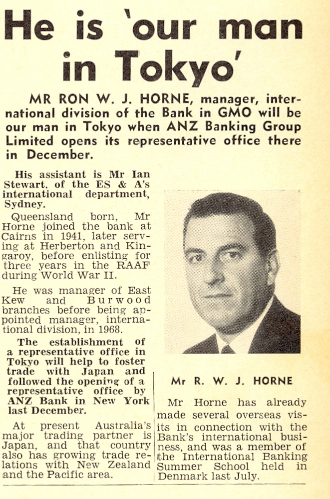 Fifty years ago – on December 3 to be precise – Ron Horne and Ian Stewart, together with their secretaries Murai san and Hara san and driver Hasegawa san, opened ANZ’s first office in Japan – the first ANZ outpost in Asia.