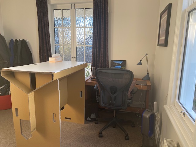 I now move between the two during the day. When I’m back in the office, the standing desk conveniently folds up and slips under the sofa.