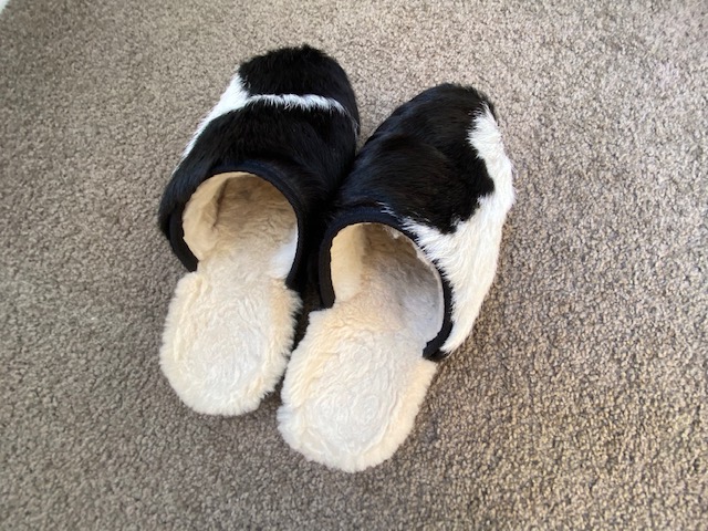 The slippers are cow hide lined with sheepskin and I love them. The most disappointing part of returning to the office was no longer being able to wear them all day. Little did I realise how well-worn they would be by now.