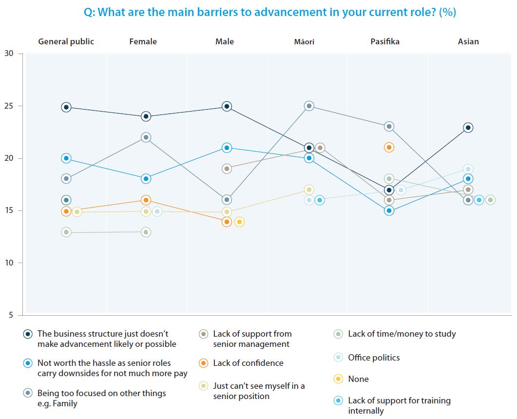 “Business structure” was the most cited barrier to advancement, alongside lack of management support for development opportunities. Younger respondents looked for more workplace support. But the need to prioritise their families was often cited by Māori and Pasifika respondents as a barrier. Some women felt the biggest barrier was attitude, as their upbringing had not set them up to aim high – or have a clear direction for their future.