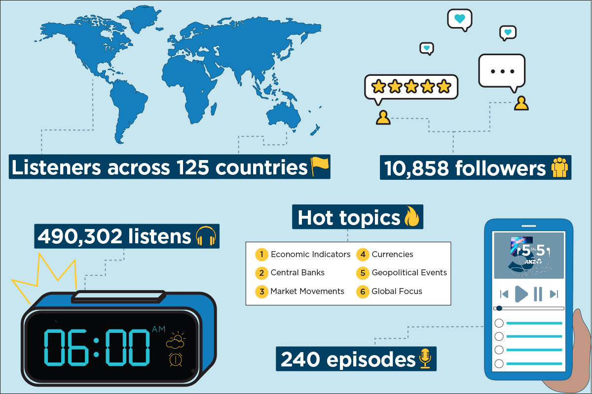 A year since the introduction of 5 in 5 with ANZ, we've reached 240 episodes, garnered almost half a million listens from 125 different countries, and attracted more than 10,800 followers. The topics that have resonated most with our audience include discussions on Australian housing prices, inflation trends, central bank policy decisions, comprehensive analyses of commodities, and insights into China's real estate market.