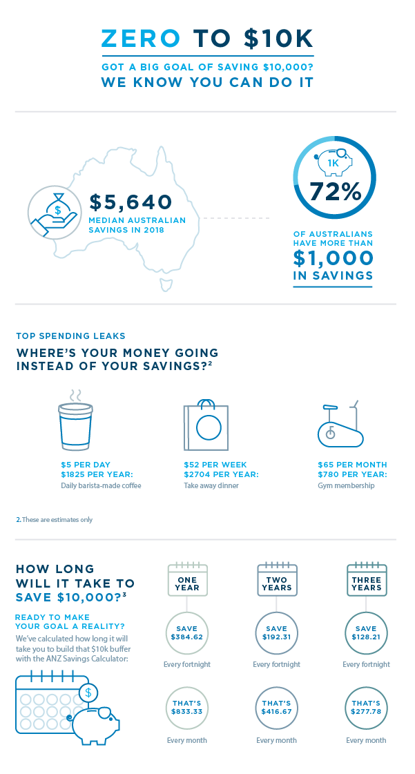 The first step towards saving more is to set a solid, smart target. Head over to the ANZ Financial Wellbeing Program to Set a Savings Goal (that you’ll actually reach) today.