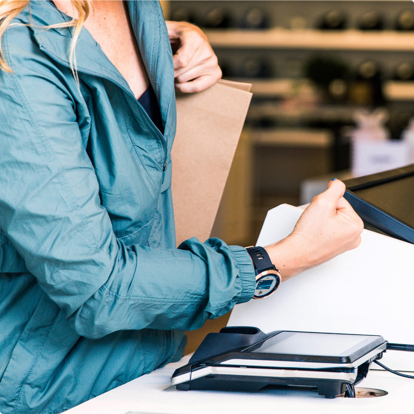 Hold your watch near the payment reader until it vibrates indicating payment’s been made.
